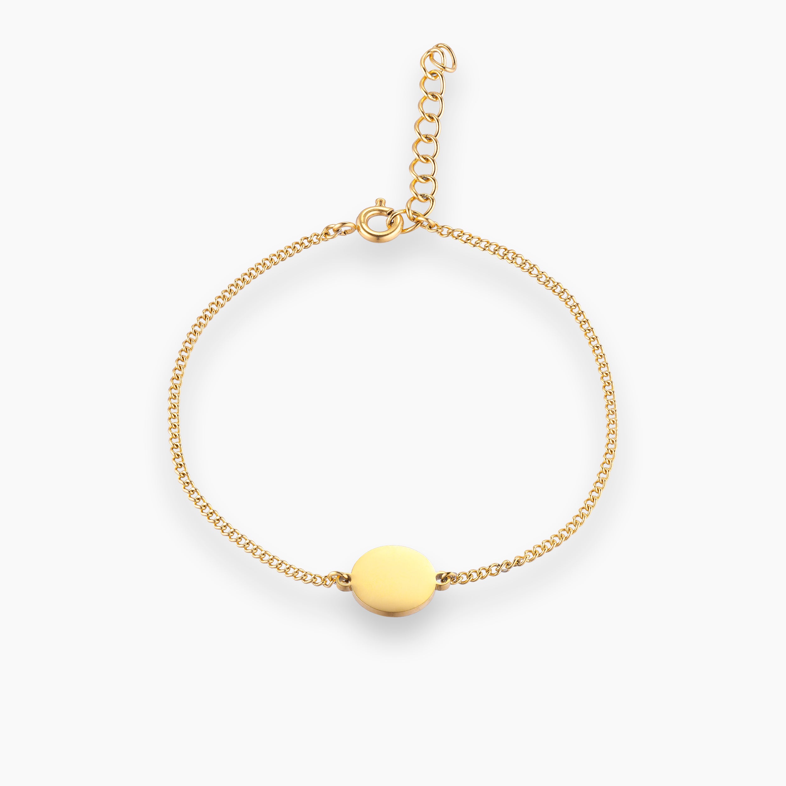 Personalized coin bracelet with polish front and matte back plated in 18 carat gold.